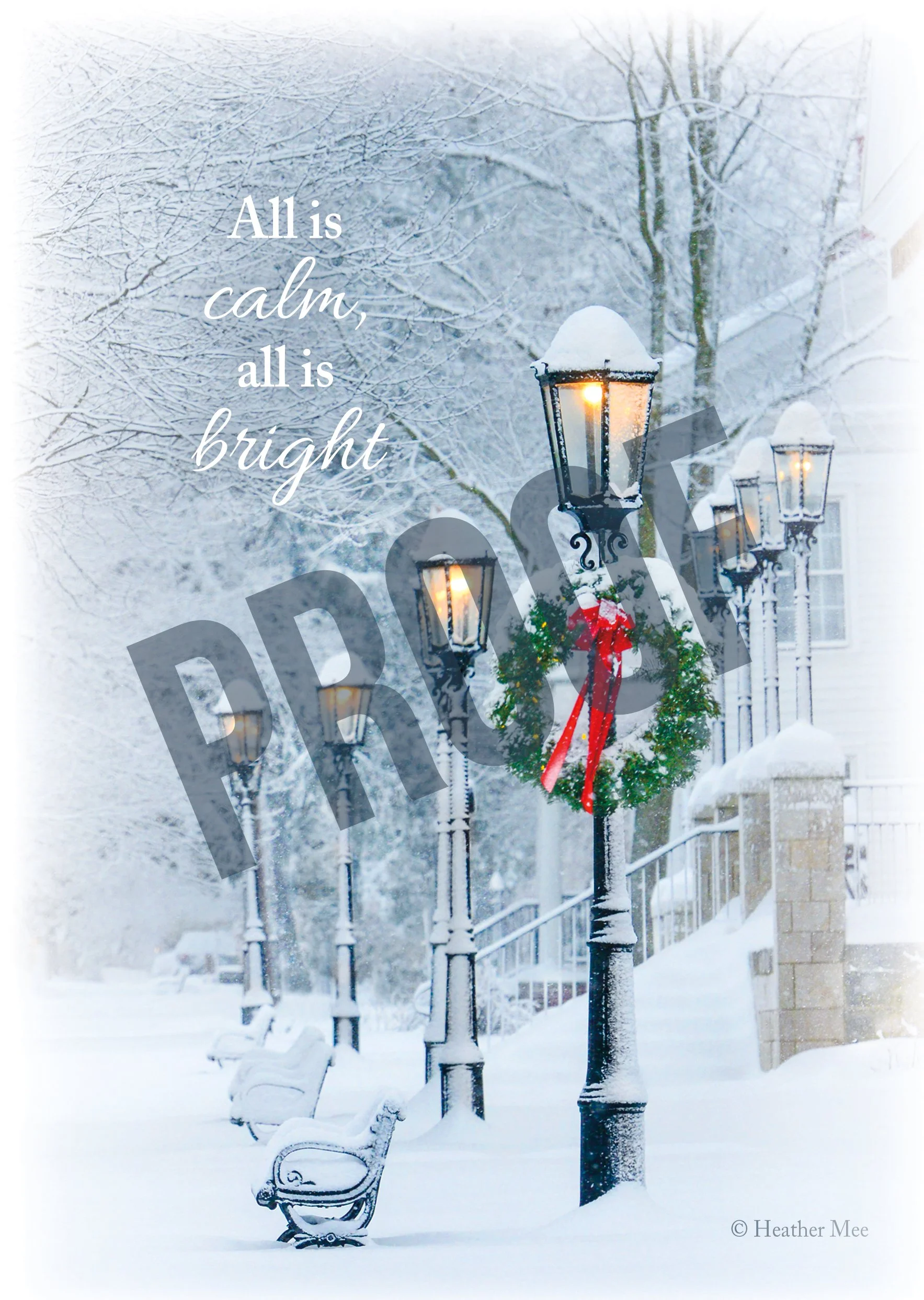 You can practically feel the snow falling in this gorgeous card! It appears to be a painting and evokes a warm and inviting feeling for all! The front of the card includes "All is calm, all is bright" and the inside of the card says, "Wishing you Peace, Light & Love this Christmas and always." Sending this card is like sending a little gift to the recipient, because they are sized to fit perfectly inside a frame!